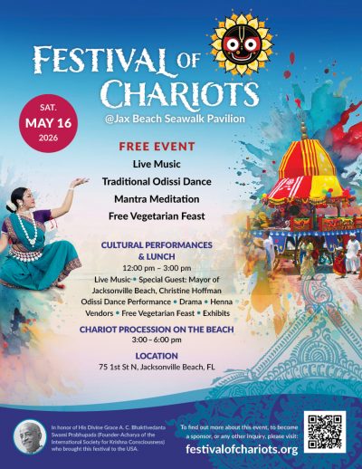 Festival of Chariots is the place to be. Brought from the cultural heart of India, this ancient Ratha Yatra festival is a free cultural offering we bring to many beautiful beaches, campuses and parades across Florida.