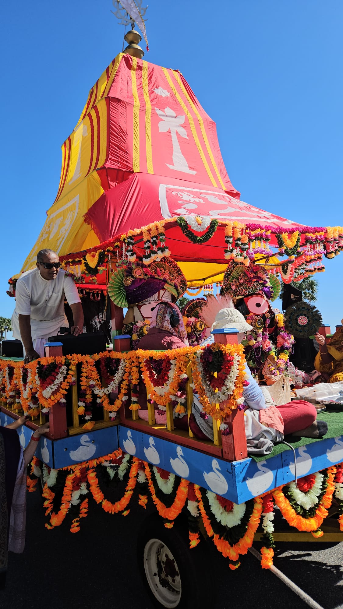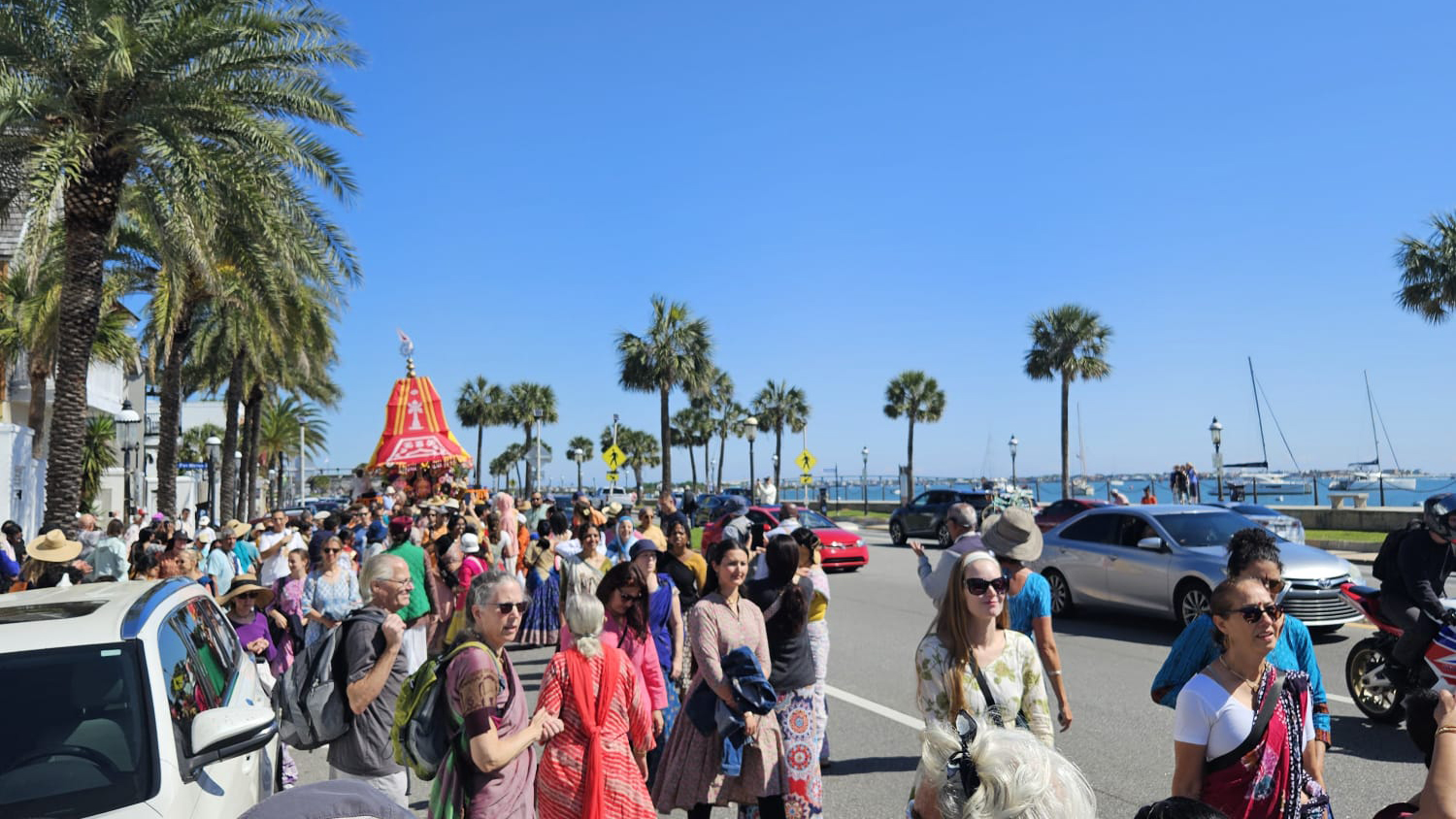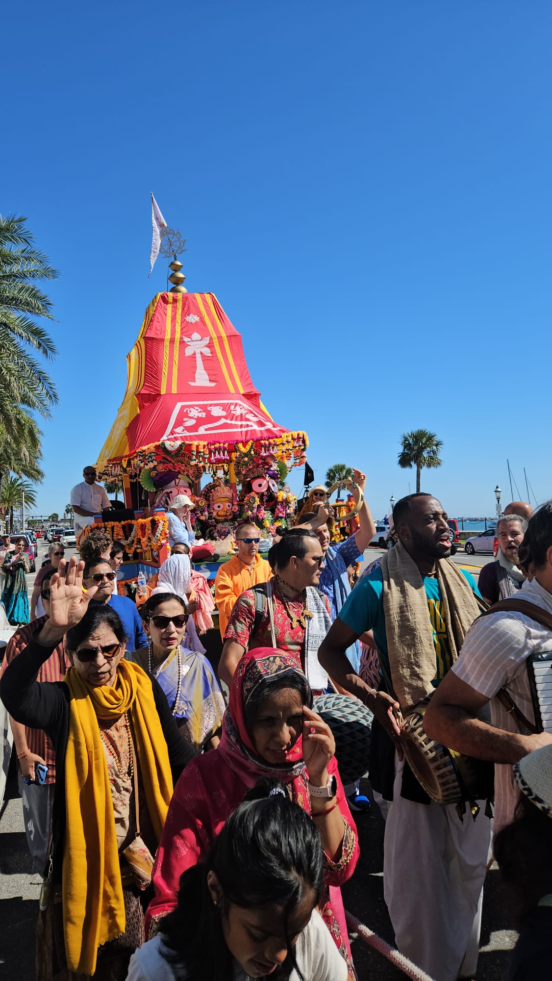 This Saturday, April 12, 2025 the St. Augustine Festival of Chariots (Rathayatra) filled the streets with melodious kirtan and a joyous atmosphere. During the procession, the beautifully decorated chariot carrying Lord Jagannath, Baladeva, and Subhadra, was accompanied by the Hare Krishna mantra, graceful youth dancers, and colorful flags and flowers calling the attention of the spectators that lined the route.